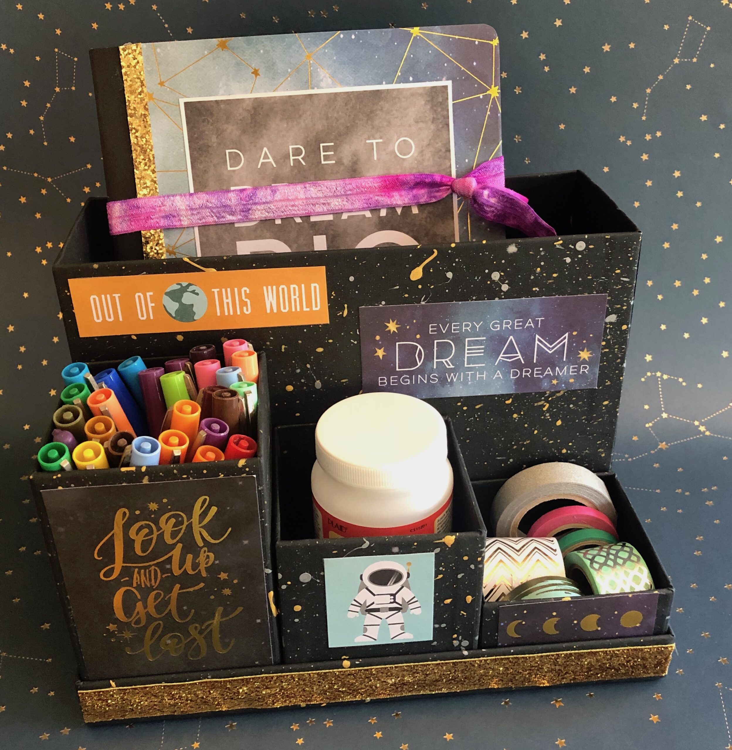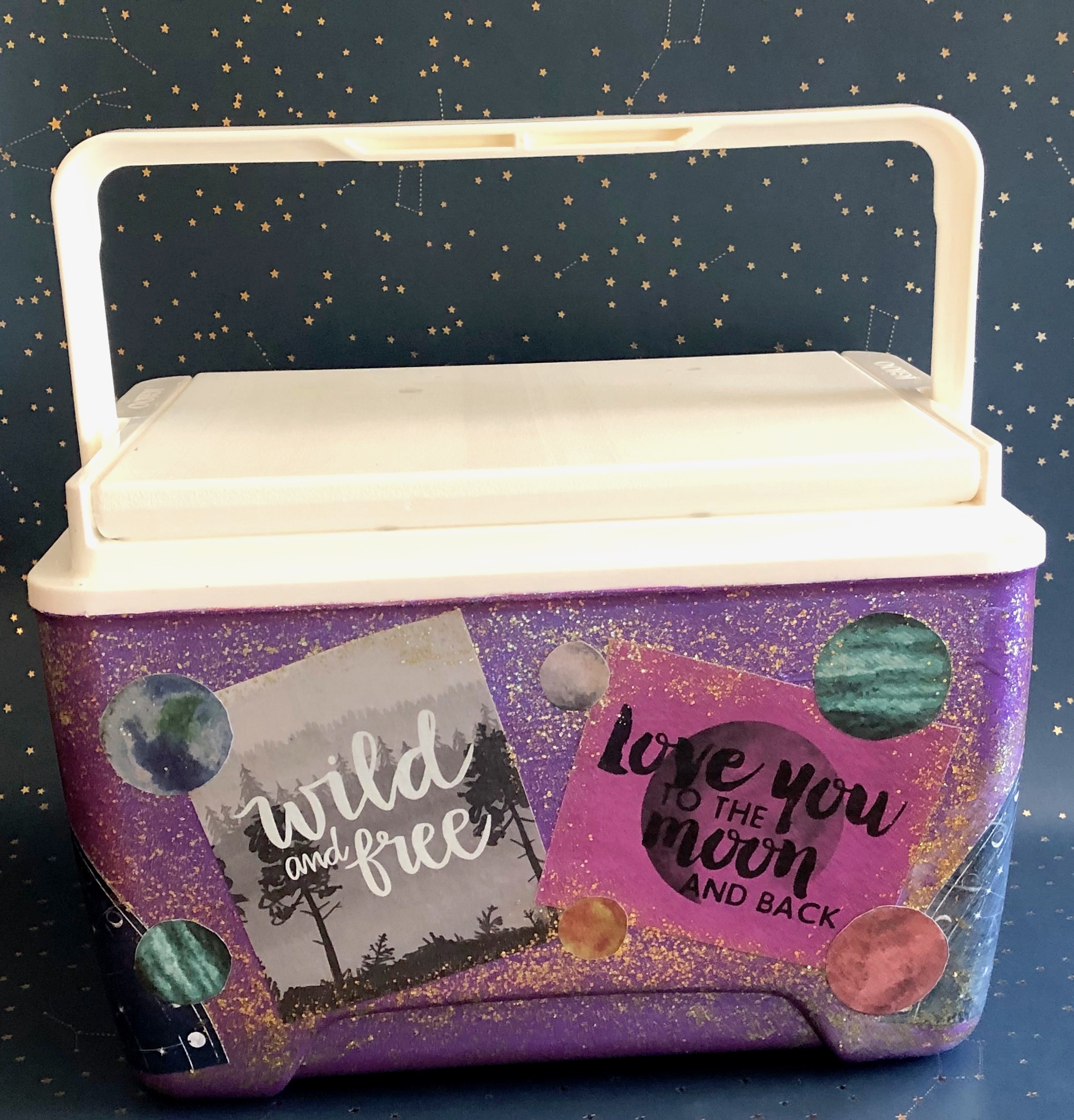 This Mod Podge party cooler is one of mu favs! You can customize in so many different ways. Look for themed scrapbooking papers or cut up old magazines! The extreme glitter Mod Podge really gives this the galactic vibe.