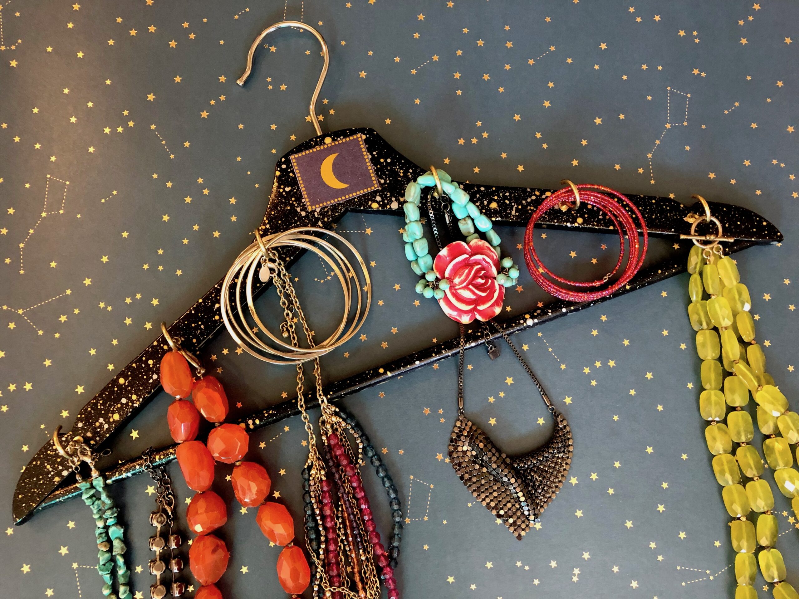I love this hanger for organizing jewelry! Not only does it look cute but you can hang a coat or shirt over it and conceal your jewelry in a closet.