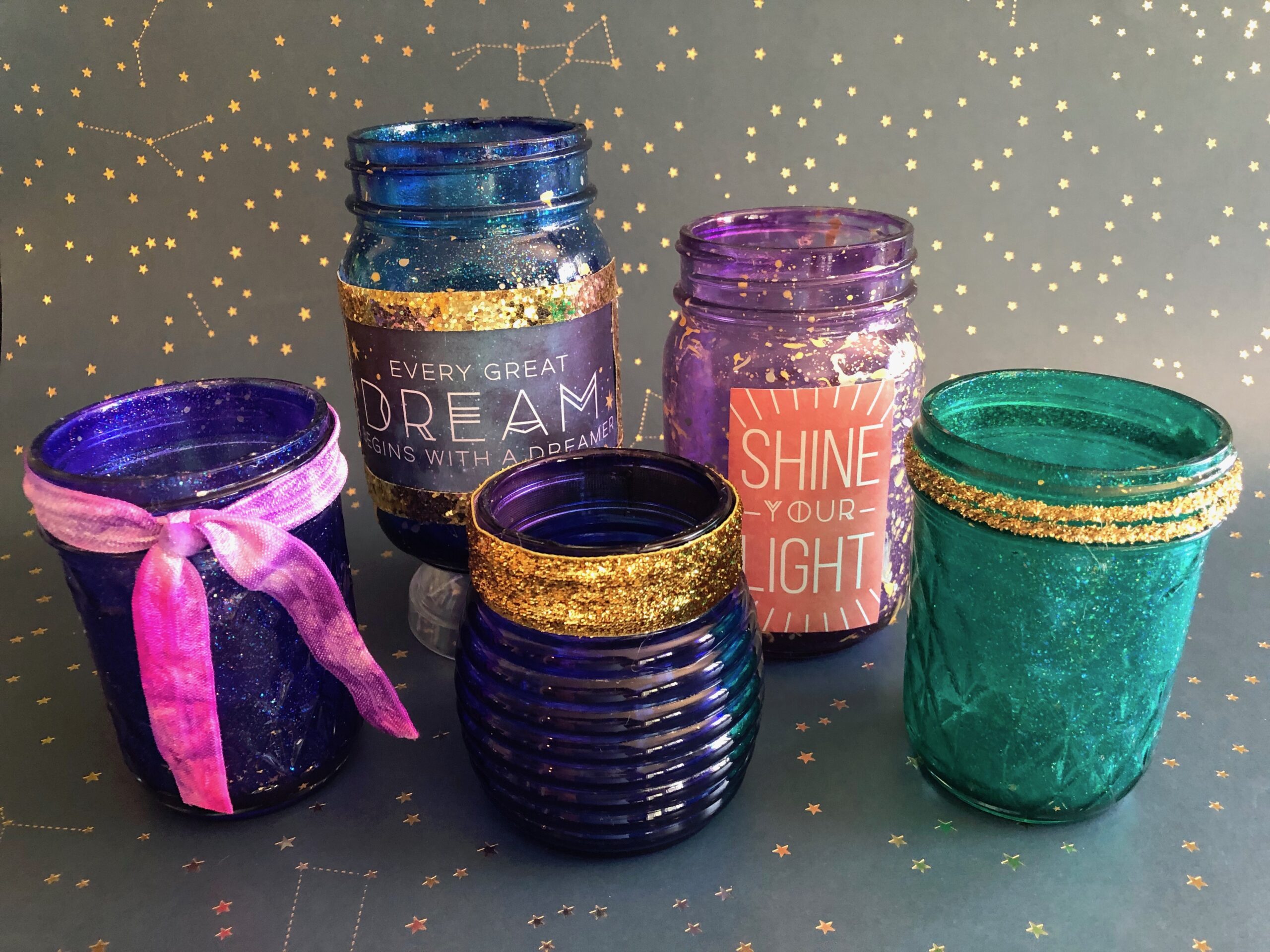 I love making these tinted Mod Podge jars! They are perfect for dorms….because you can add fairy lights or battery candles to them and they glow so pretty!