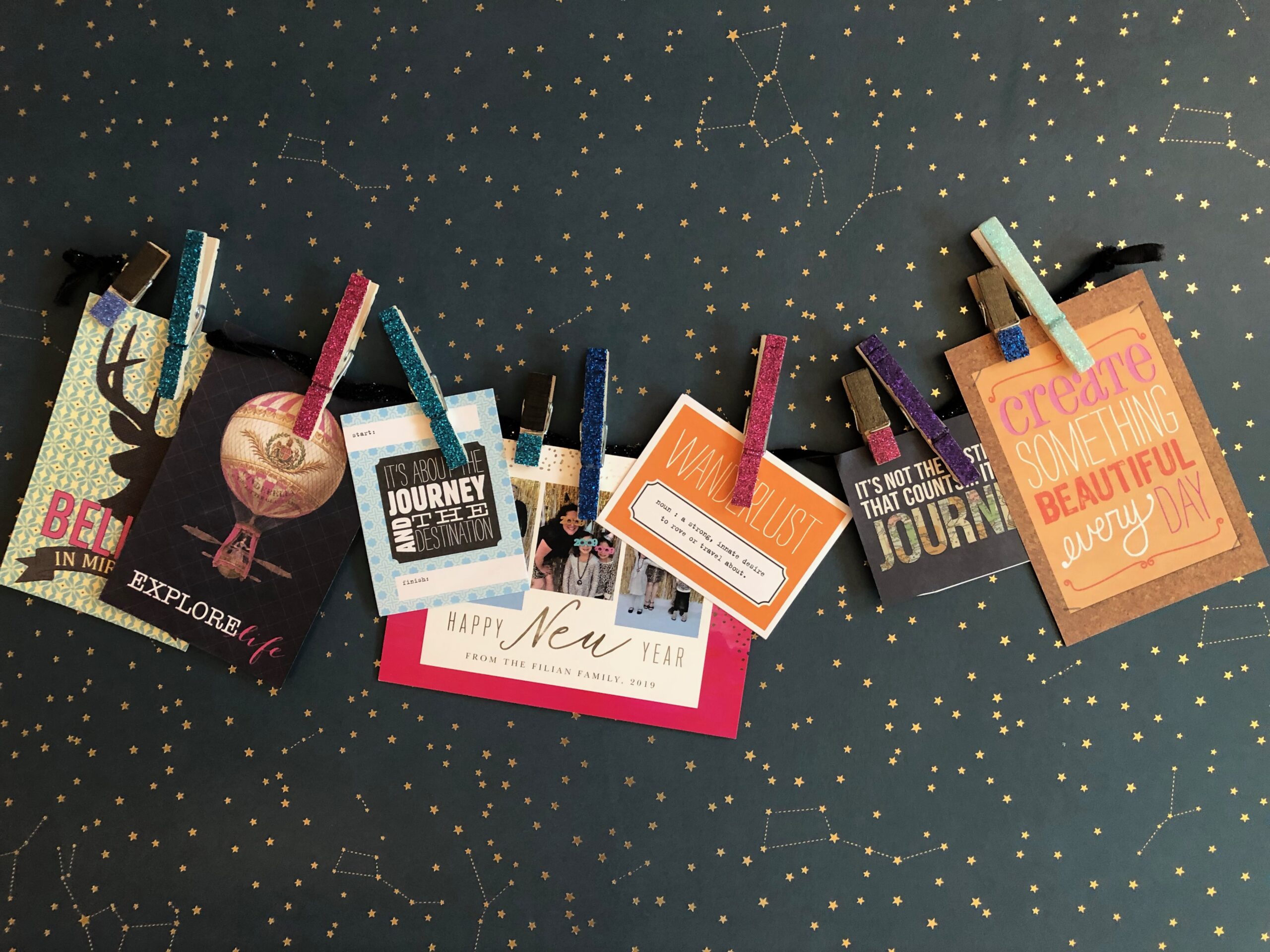In a dorm you will want to hang pictures and paper decorations. You can use hooks to hang a string or wire then add glittered clothespins and your favorite pics.