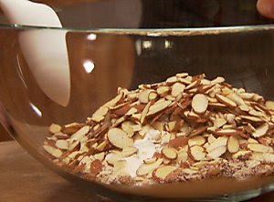 1. Preheat oven to 350 degrees Fahrenheit. In a mixing bowl, combine flour, sugar and baking powder. Add almonds.