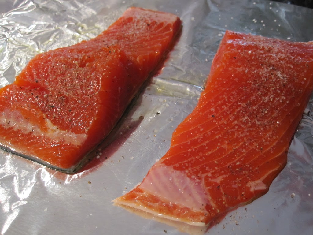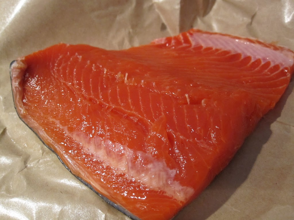 Begin with a large salmon fillet (1 pound-ish with the skin on). Wash the fish with cold water and pat dry with a paper towel. Run your hands along the top to feel any bones. Remove the bones with a quick pull.