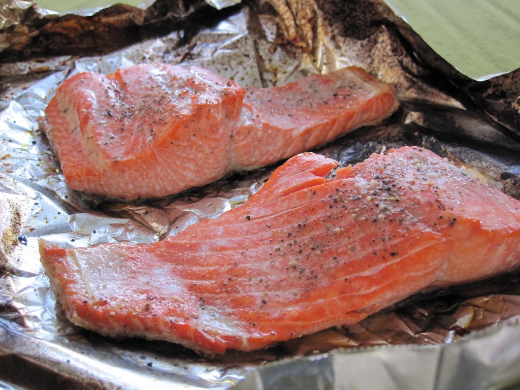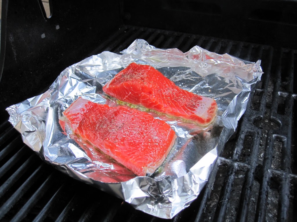 Pre-heat the grill to Medium-High. Place the foil and salmon on the grill and cook for 7 minutes. Add a minute or two extra for thicker or larger fillets.