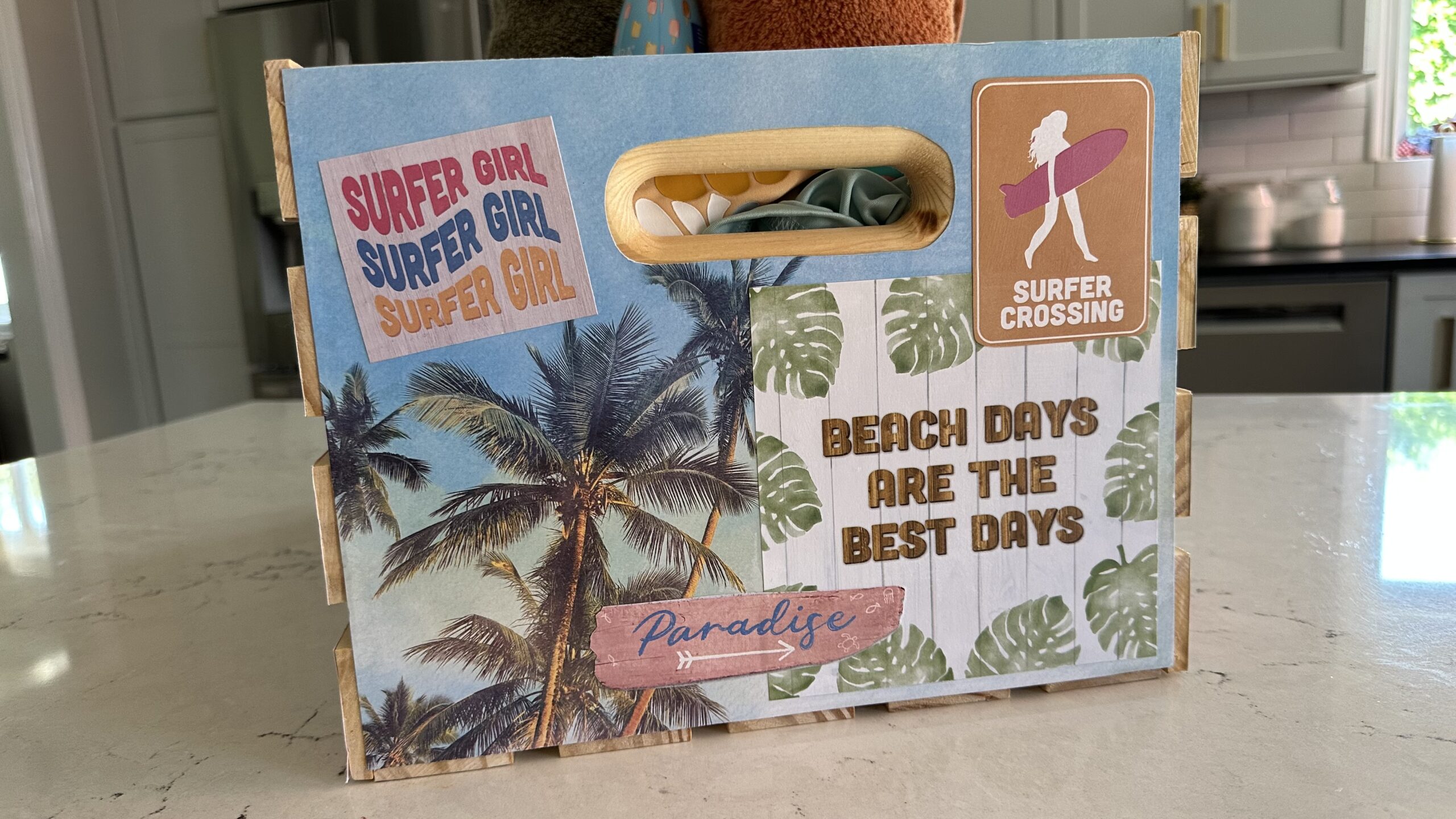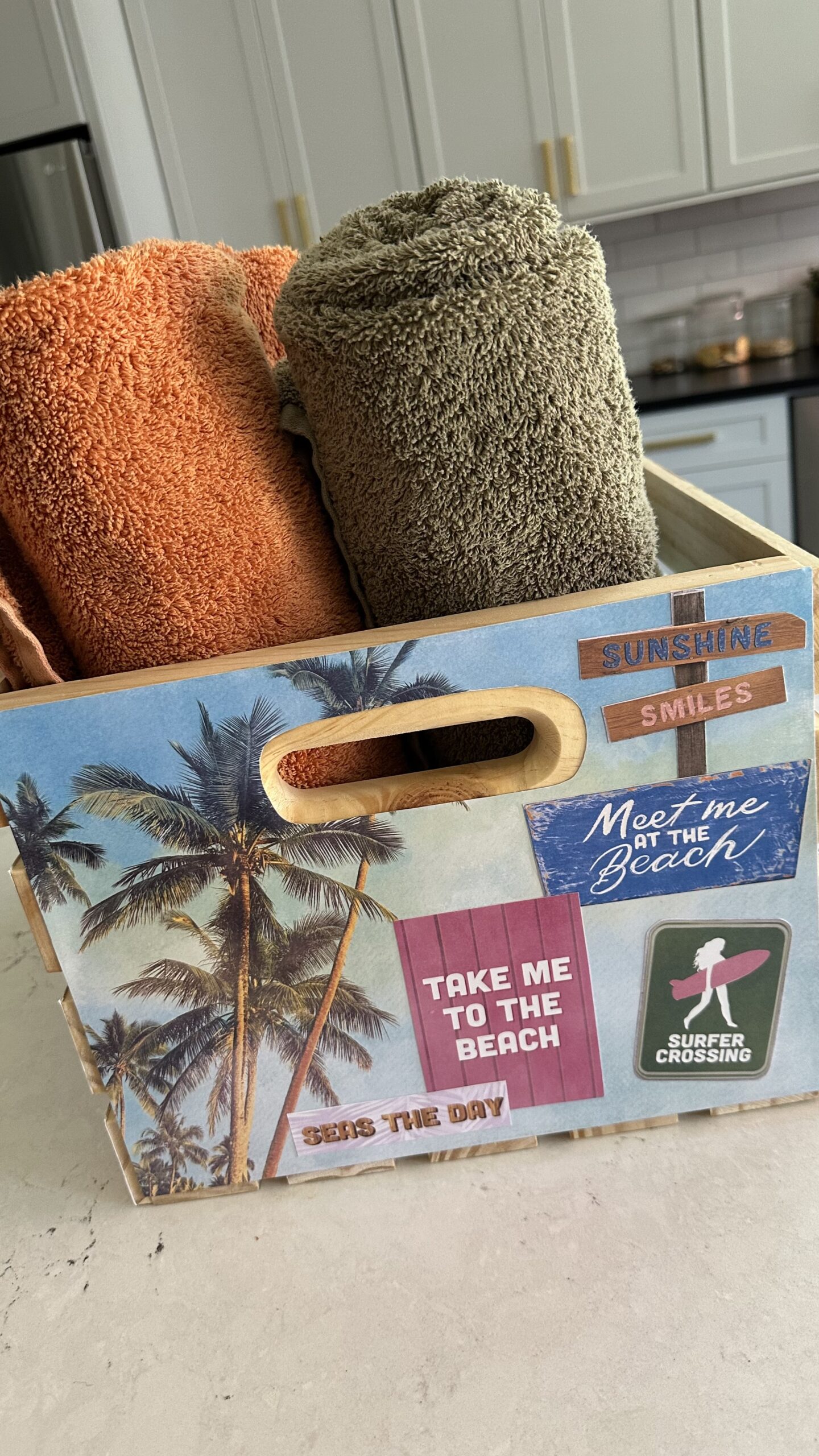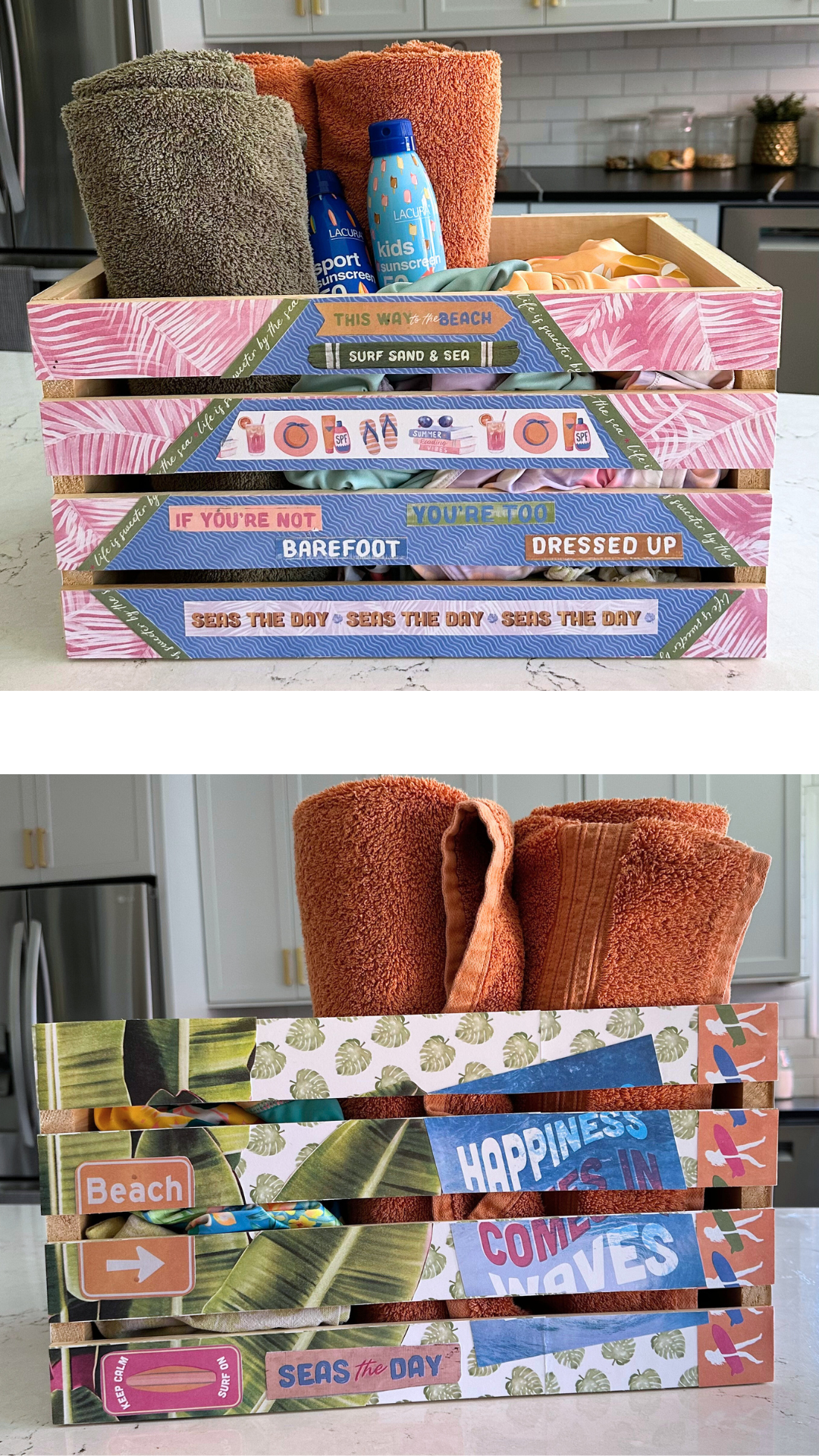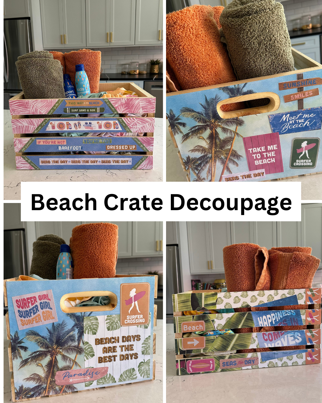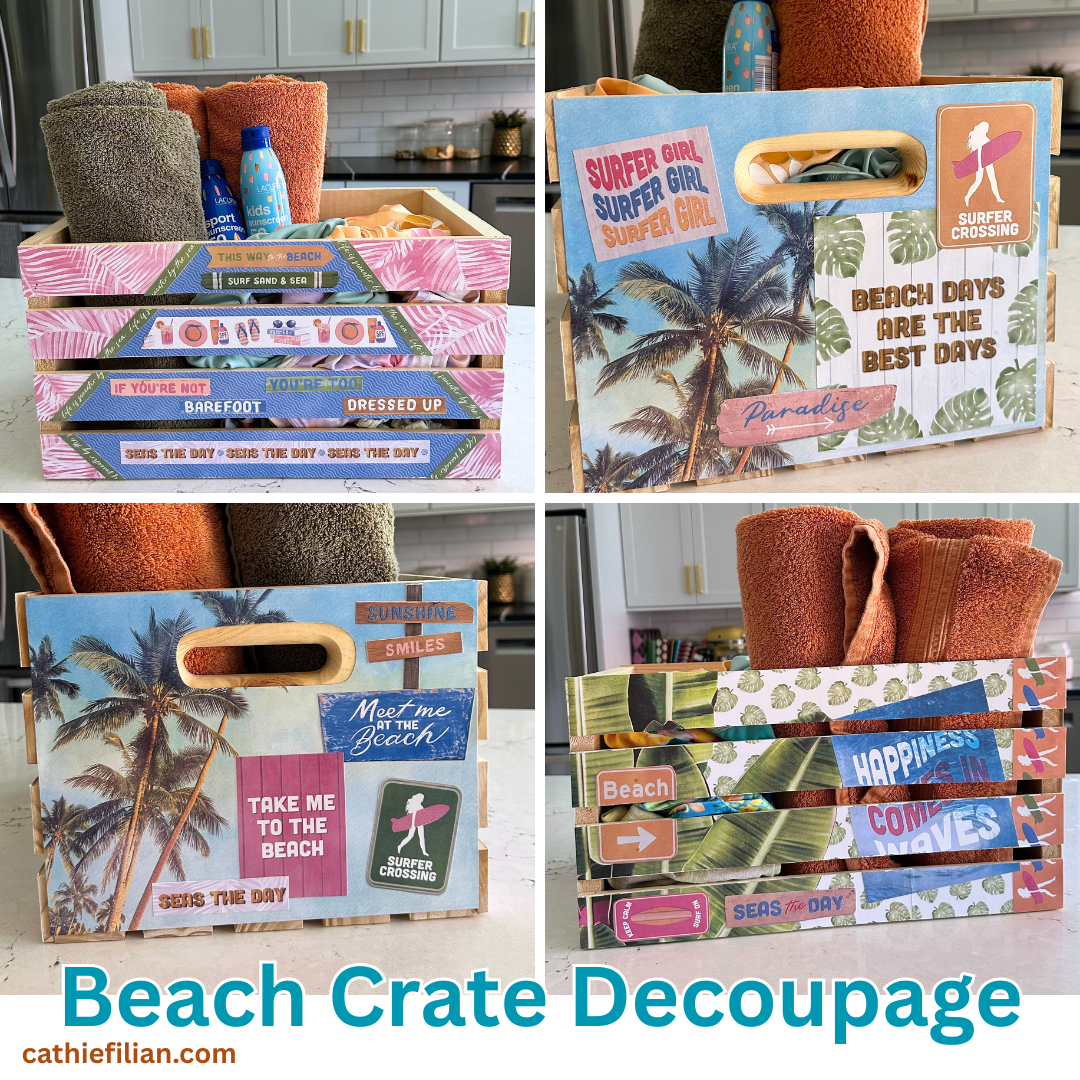 Create a Beach Bikini Box for your swimsuits, towels and sunscreen! These cute crate makeovers are all over TikTok and Instagram! In the video below, I’m teaching paper collage and how to make a beach swimsuit and towel box.
