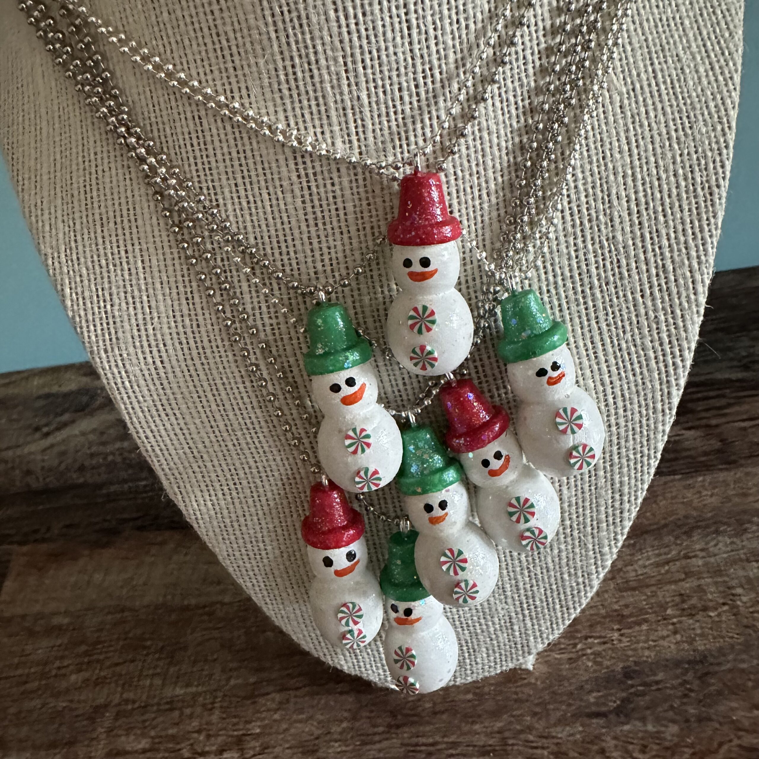 You can use any kind of chain or ribbon for the necklaces. I like the ball chain because it’s inexpensive and easy for kids. I added little clay slices to the belly of snowman but you could paint dots or even add rhinestones.