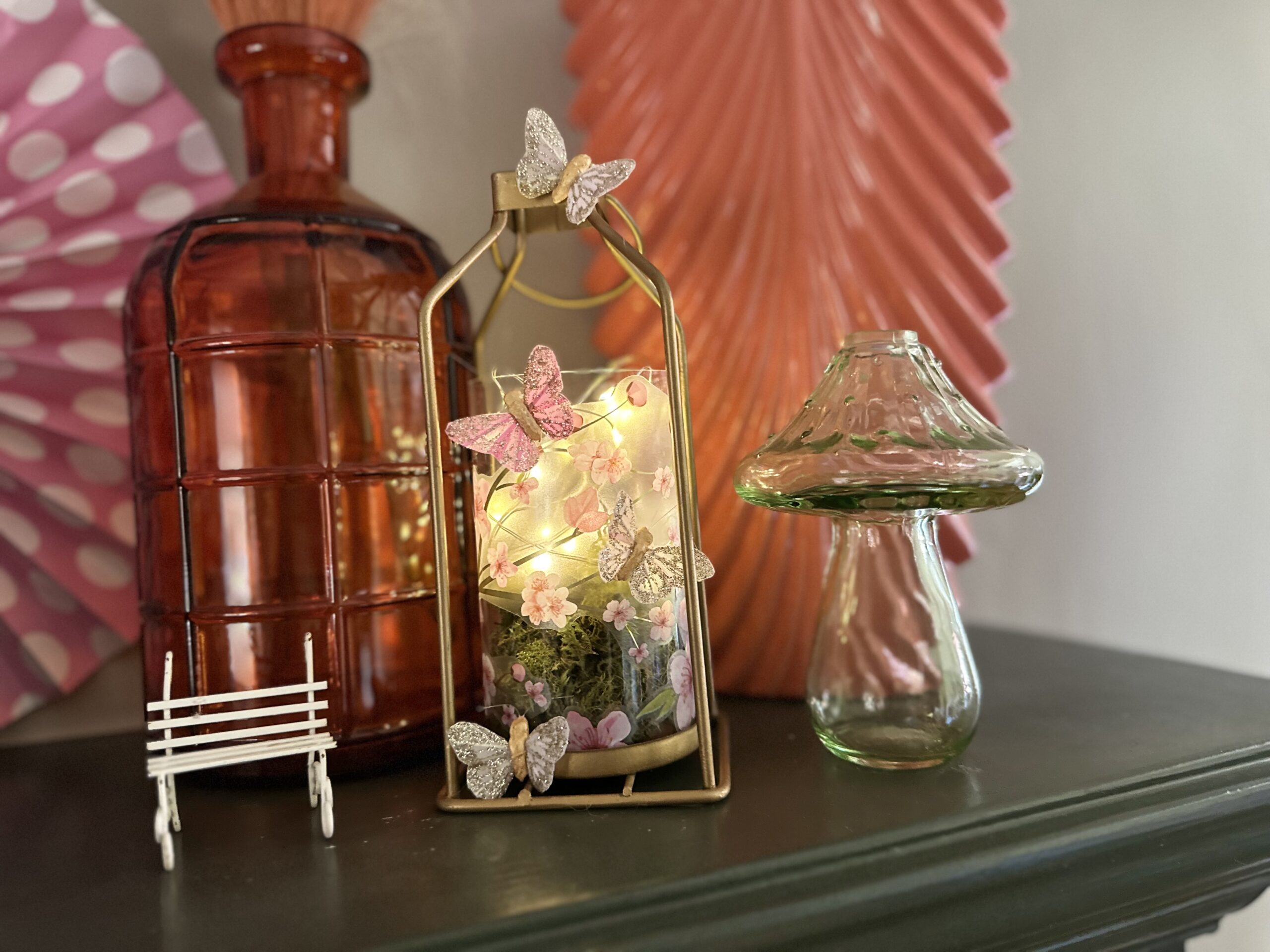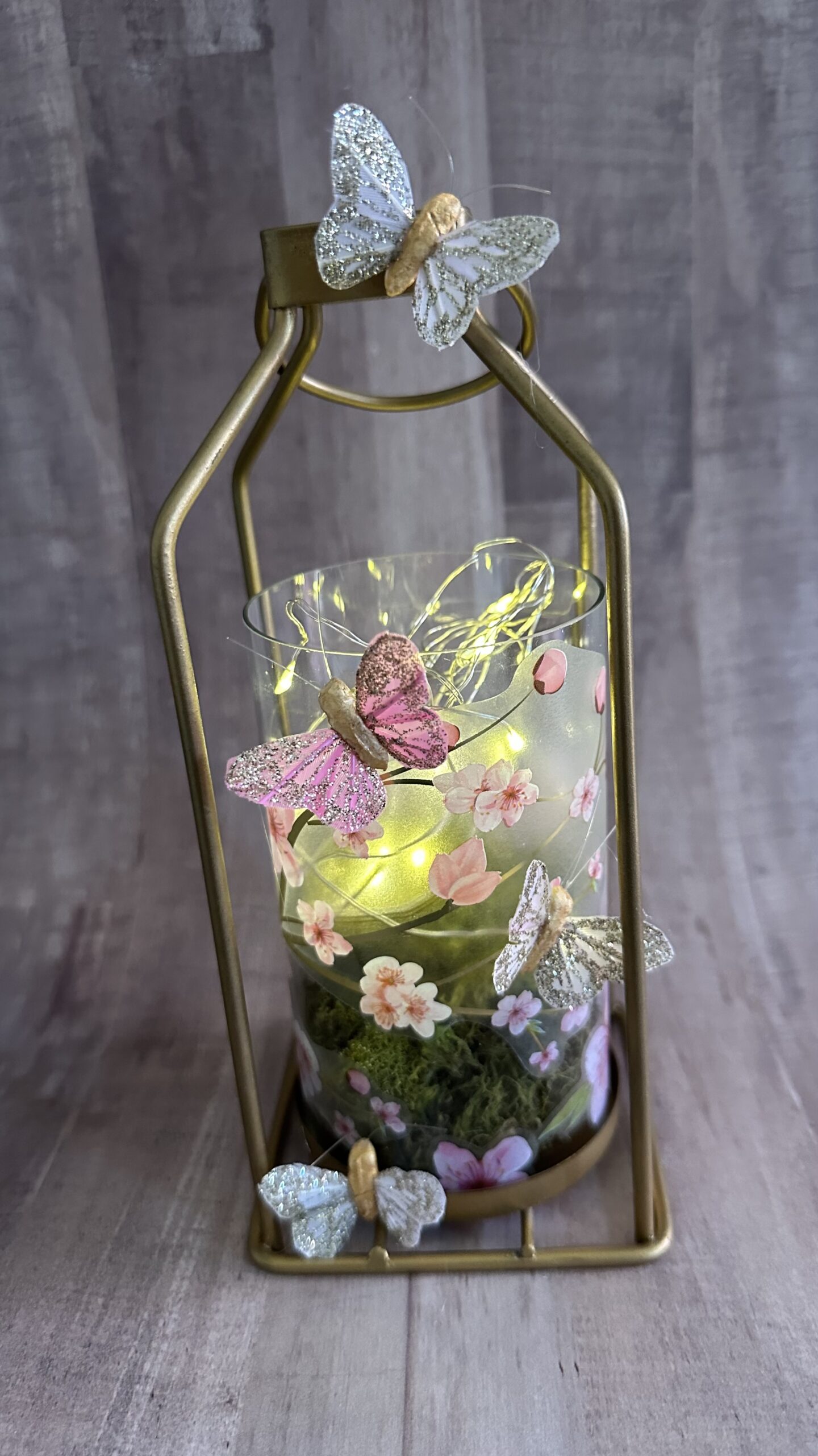 You can also add a little diorama with fairies, mushrooms, flowers, little animals….etc to the inside of the candle holder. Remote controlled lights would be good if you added items to the fairy lights.