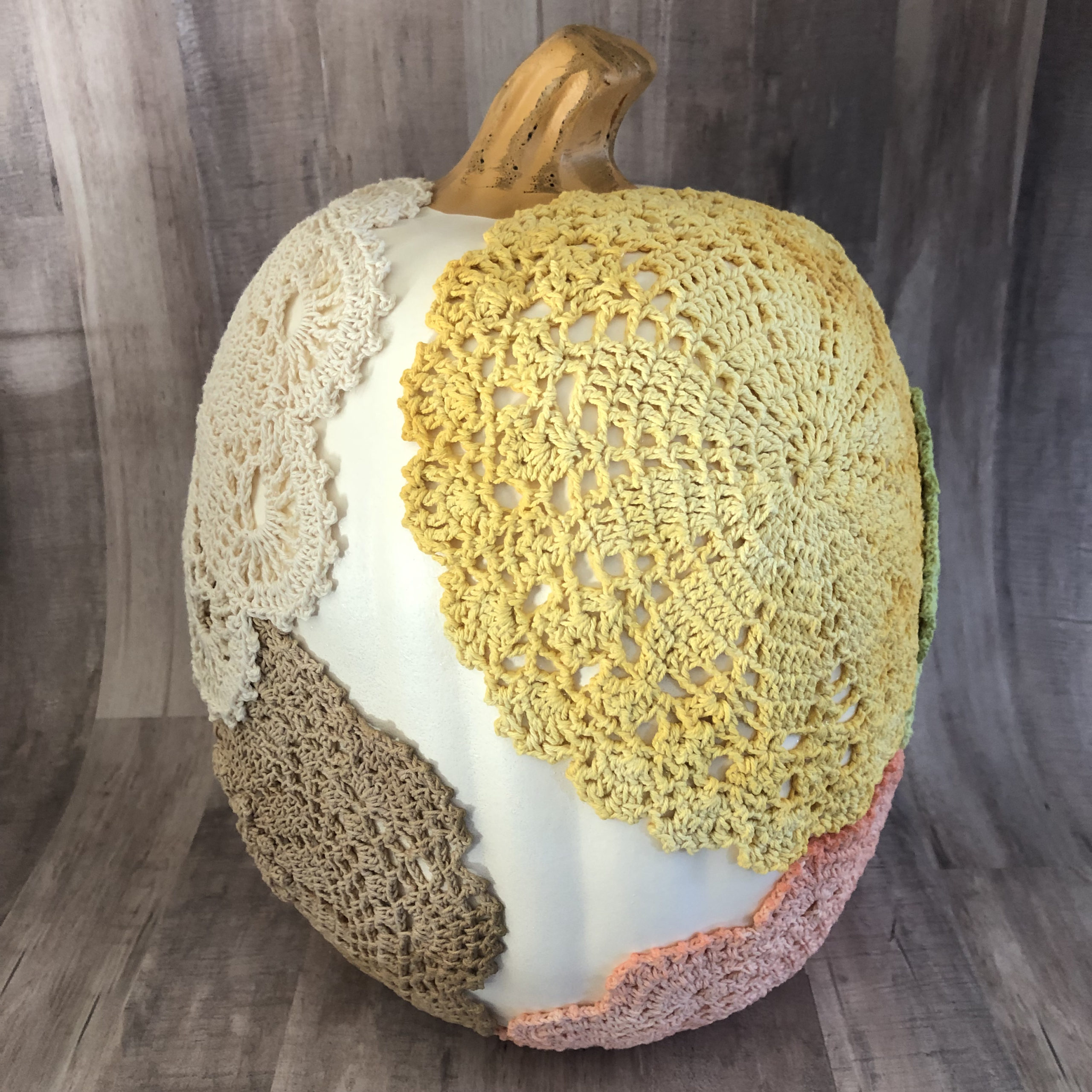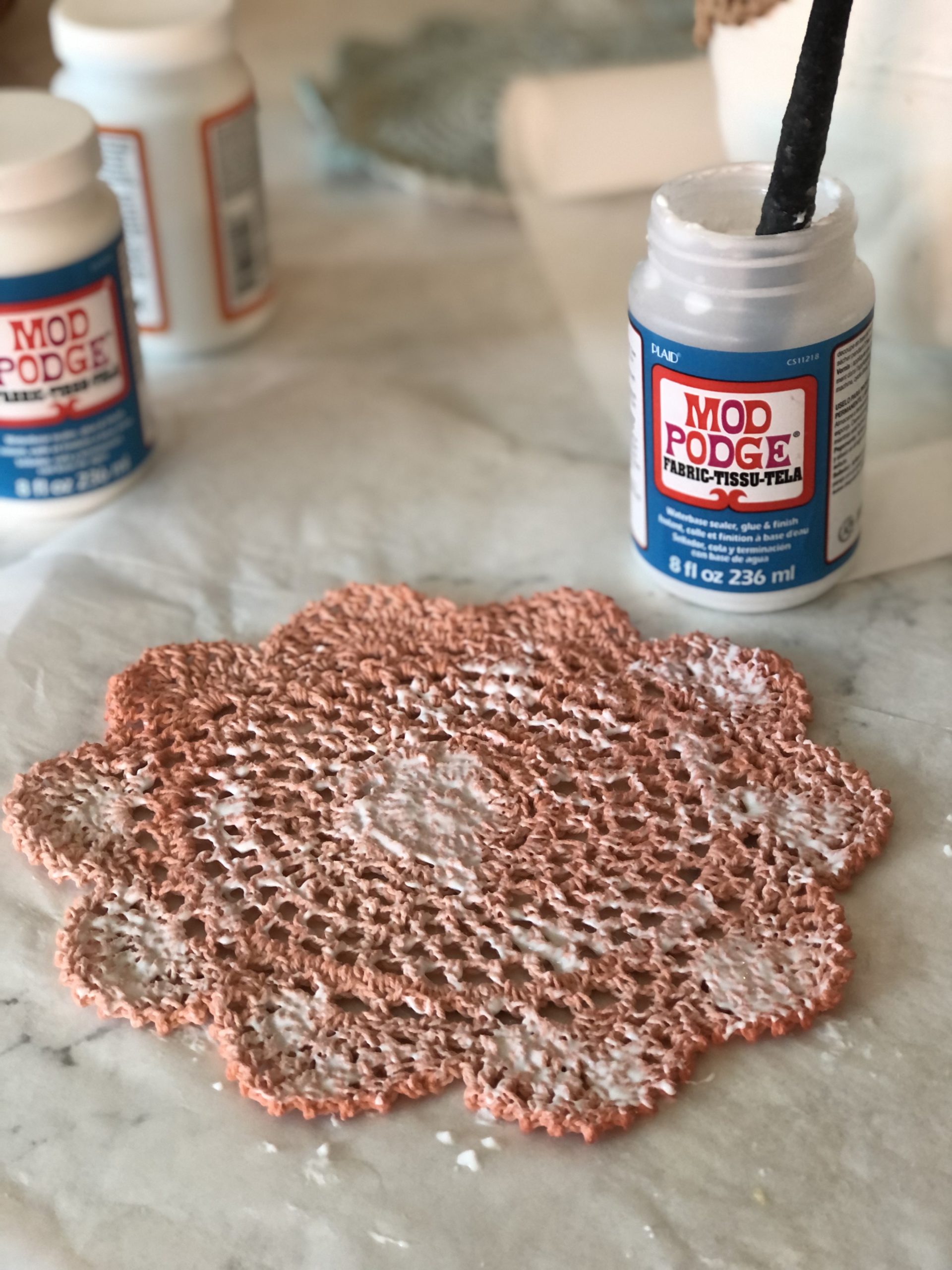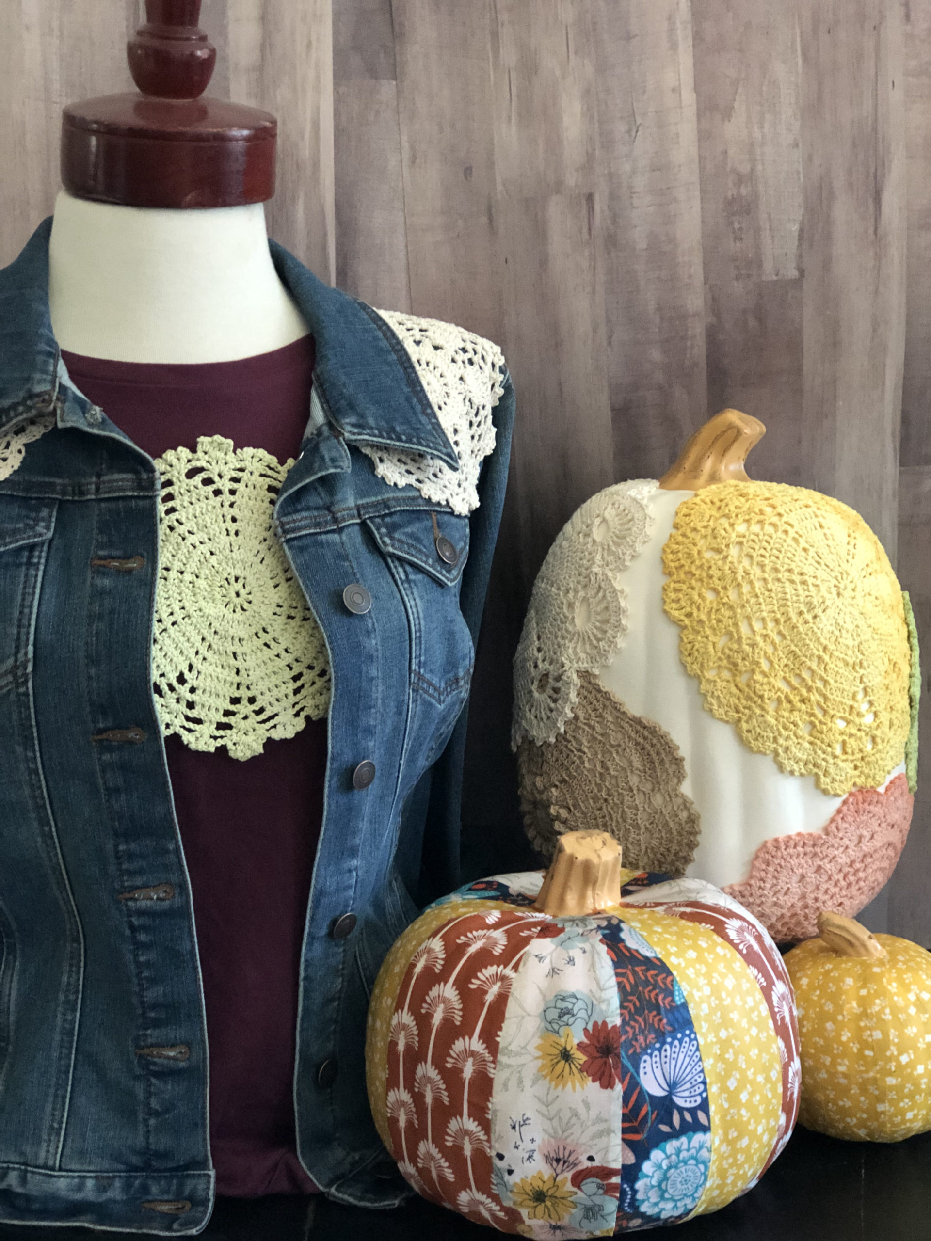 The doilies can be used on anything from a pumpkin to a jean jacket! I’m using Mod Podge Fabric to attach the doilies.