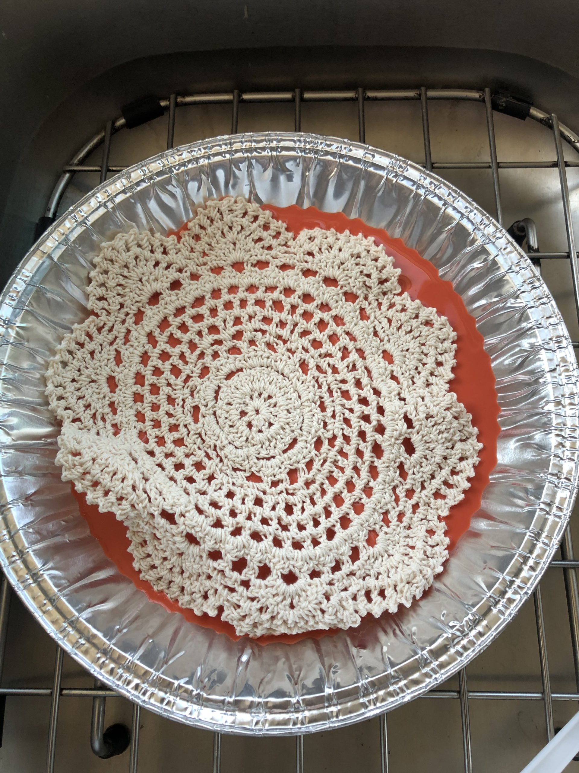 To make the dye-bath, I just added a small amount of FolkArt Multi-Surface Paint to water. You’ll will want to blend it well so you don’t have any lumps in the paint/water mixture. Then you can just toss in a light colored doily.