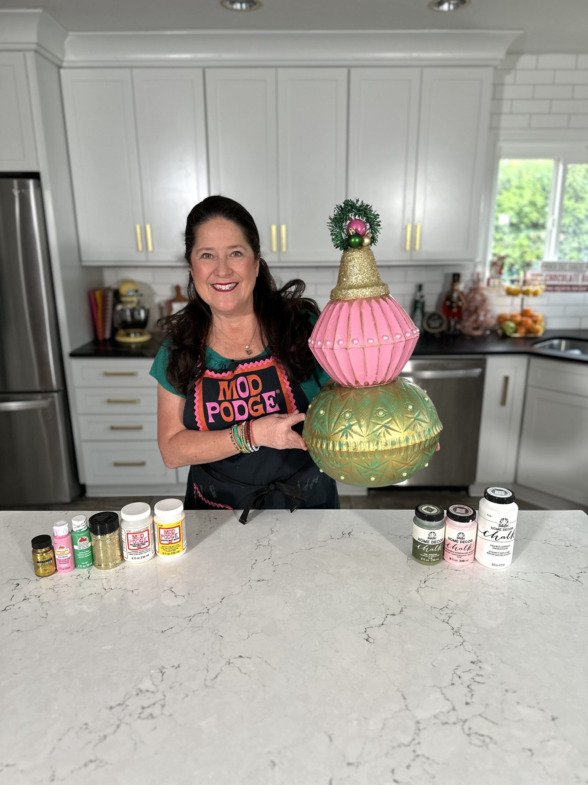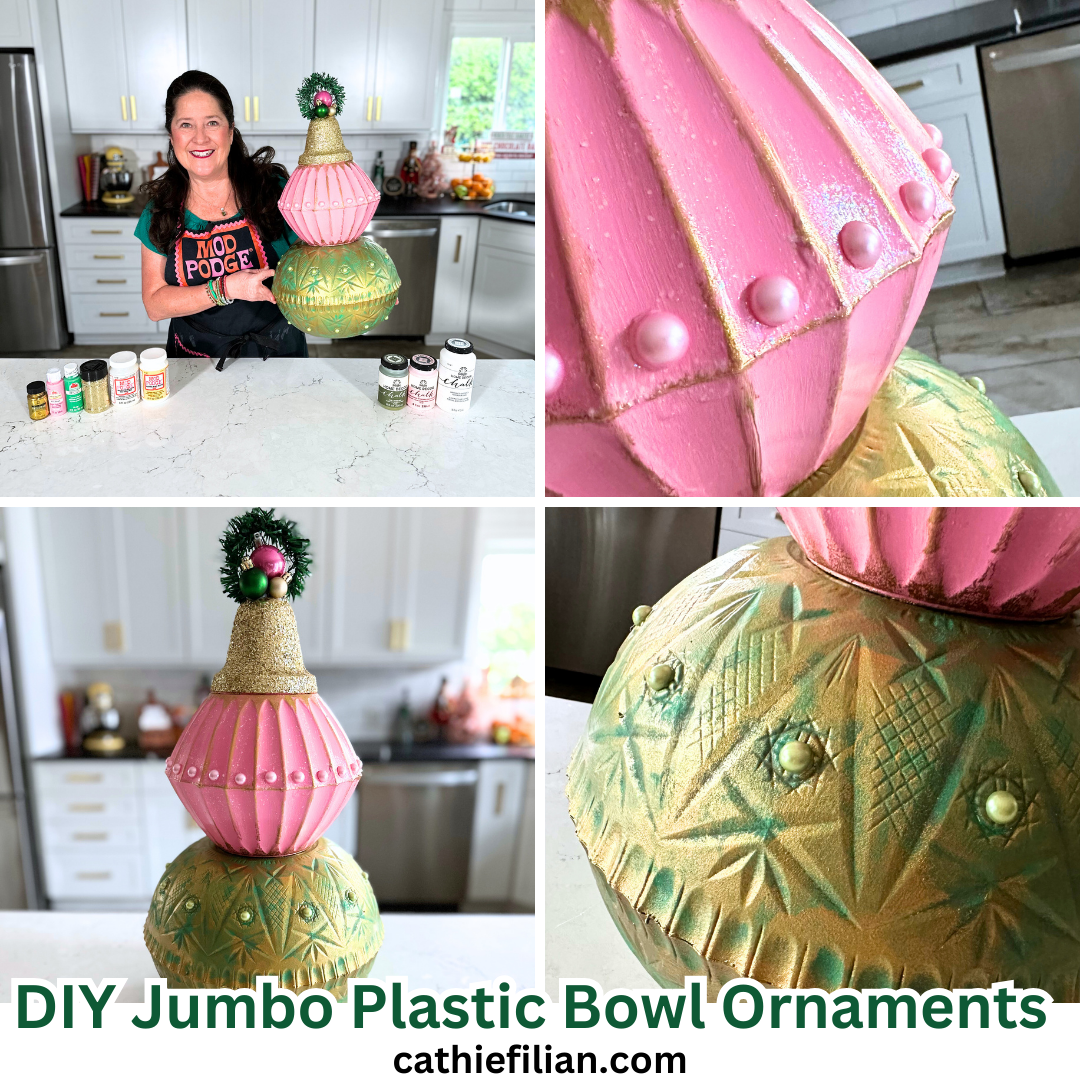 Learn how to Make Jumbo Ornaments with Dollar Tree Plastic Bowls and Mod Podge! These Gorgeous Jumbo Ornaments are made with Dollar Tree plastic bowls, paints and Mod Podge! In the DIY video below, I’m teaching this fun painting craft technique inspired by the pink,  green and gold colors from the movie, “Wicked.”