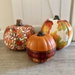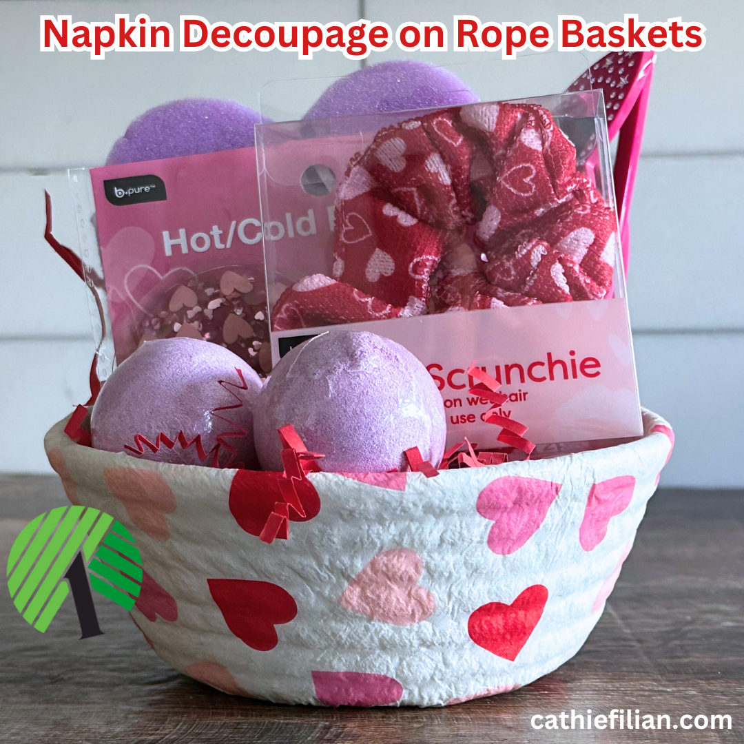 I love this technique of napkin decoupage on rope baskets and bowls. It’s super easy to do and the results are really pretty. Look for napkins with all over prints for best results.