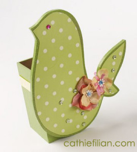 3. Using hot glue, attach a ribbon around the back of the caddy. Glue layered petals, flower trim and rhinestones near the tail of the bird. Glue a rhinestone for an eye and add additional stones around the base of the bird.